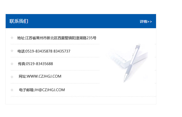地址:常州市新北區友邦商務大廈1幢16、17層  電話:0519-85101652  傳真:0519-85112595  郵編:213022  網址:www_cz-jiayue_cn.noyongjin.com  郵箱:xiajifengaa@163.com
